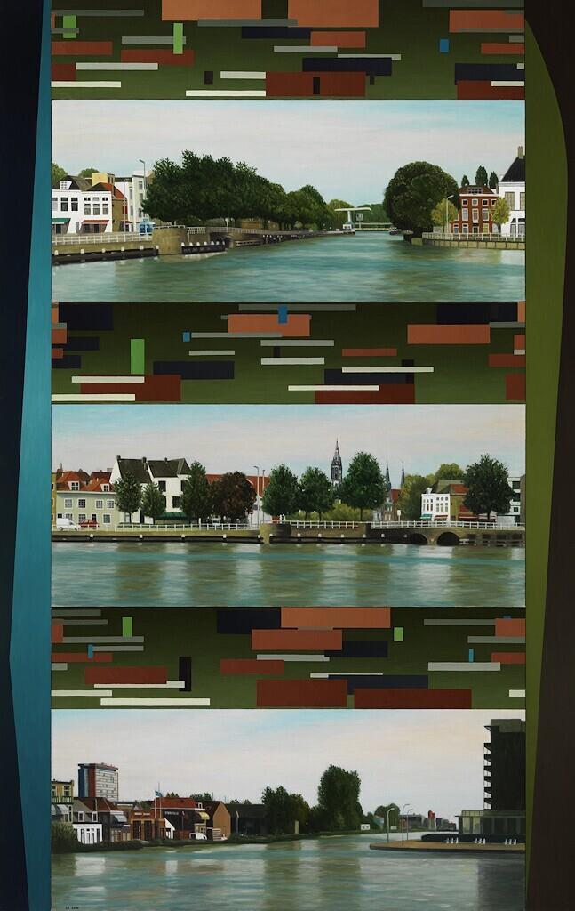 Het werk bestaat uit verschillende onderdelen die strak tegen elkaar zijn gemonteerd en zo een schilderij vormen. Het toont de tegenstelling tussen figuratie en abstractie, waarbij abstractie en figuratie afzonderlijke onderdelen zijn. Door de teg...