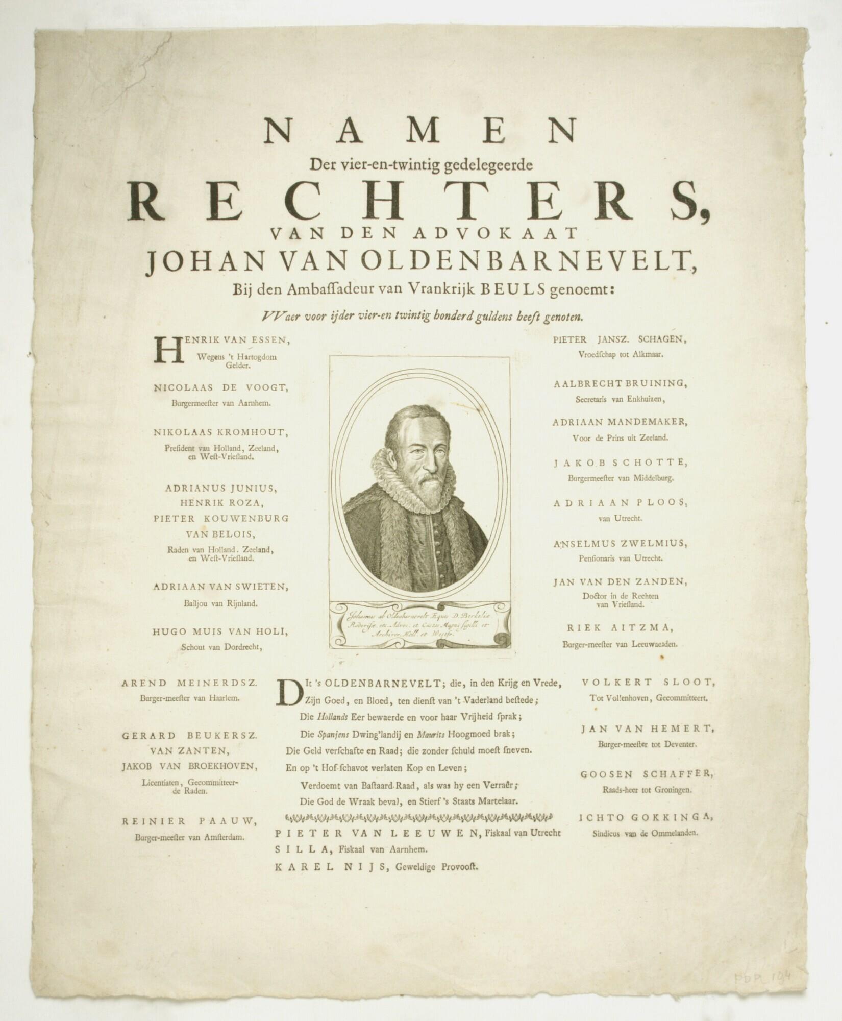- 'Namen Der vier-en-twintig gedelegeerde Rechters, van den advokaat Johan van Oldenbarnevelt, Bij den Ambassadeur van Vrankrijk Beuls genoemt: Waer voor ijder vier-en twintig honderd guldens heeft genoten'