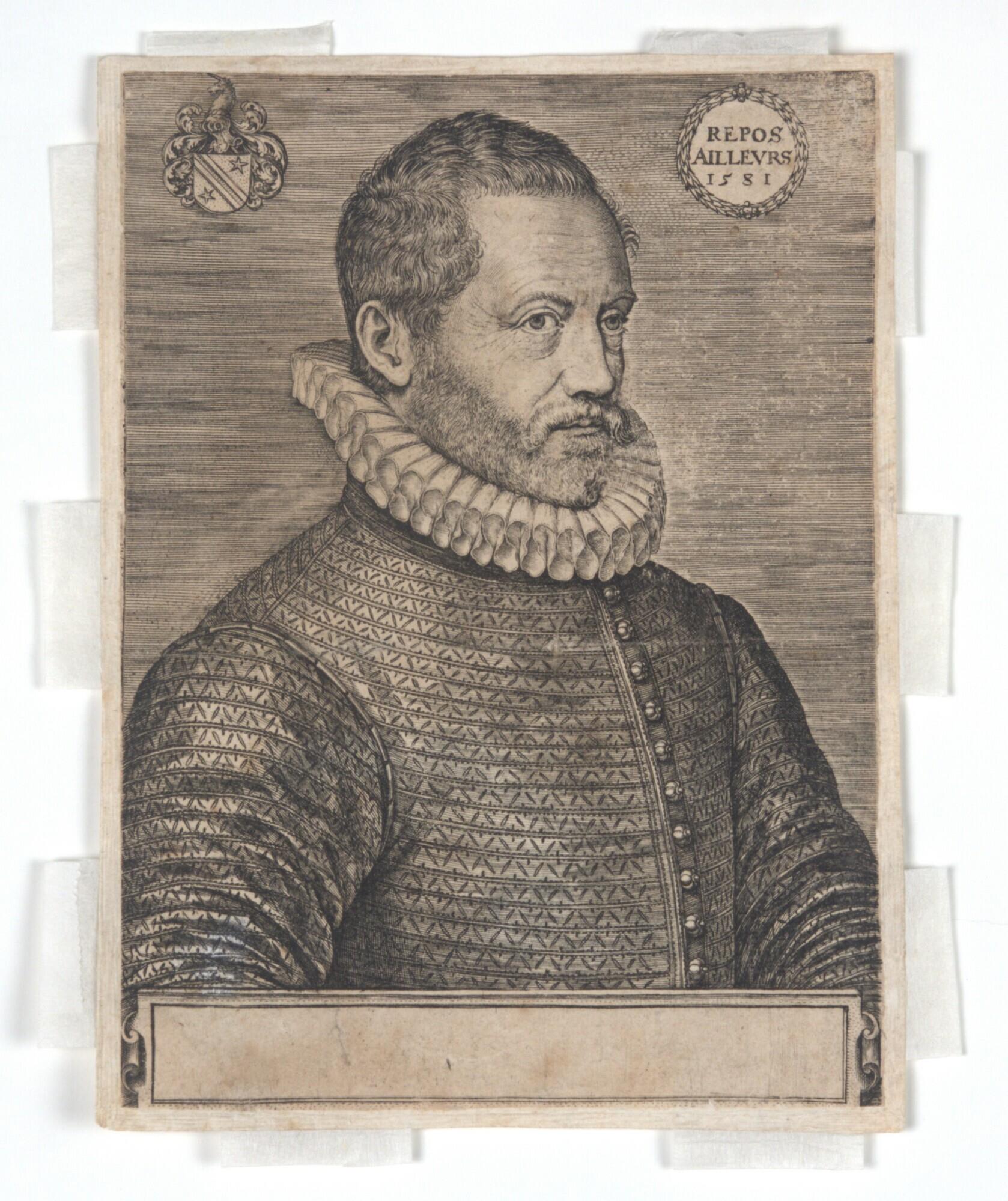 Portret van Philips van Marnix van Sint Aldegonde. Borstbeeld naar rechts in gearceerde achtergrond. Links zijn wapen, rechts in bladkrans de spreuk: 'Repos ailleurs 1581'
