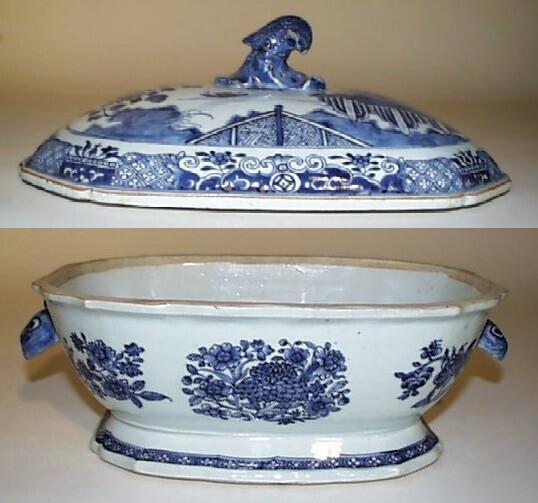 De achtkantige en licht gecontourneerde, gedekselde terrine heeft een concave voet, handgrepen in de vorm van hazenkoppen en een achtkantig gewelfd deksel met een golfvormige knop. De buitenwand is gedecoreerd met pioenrozen en op de voet loopt ee...