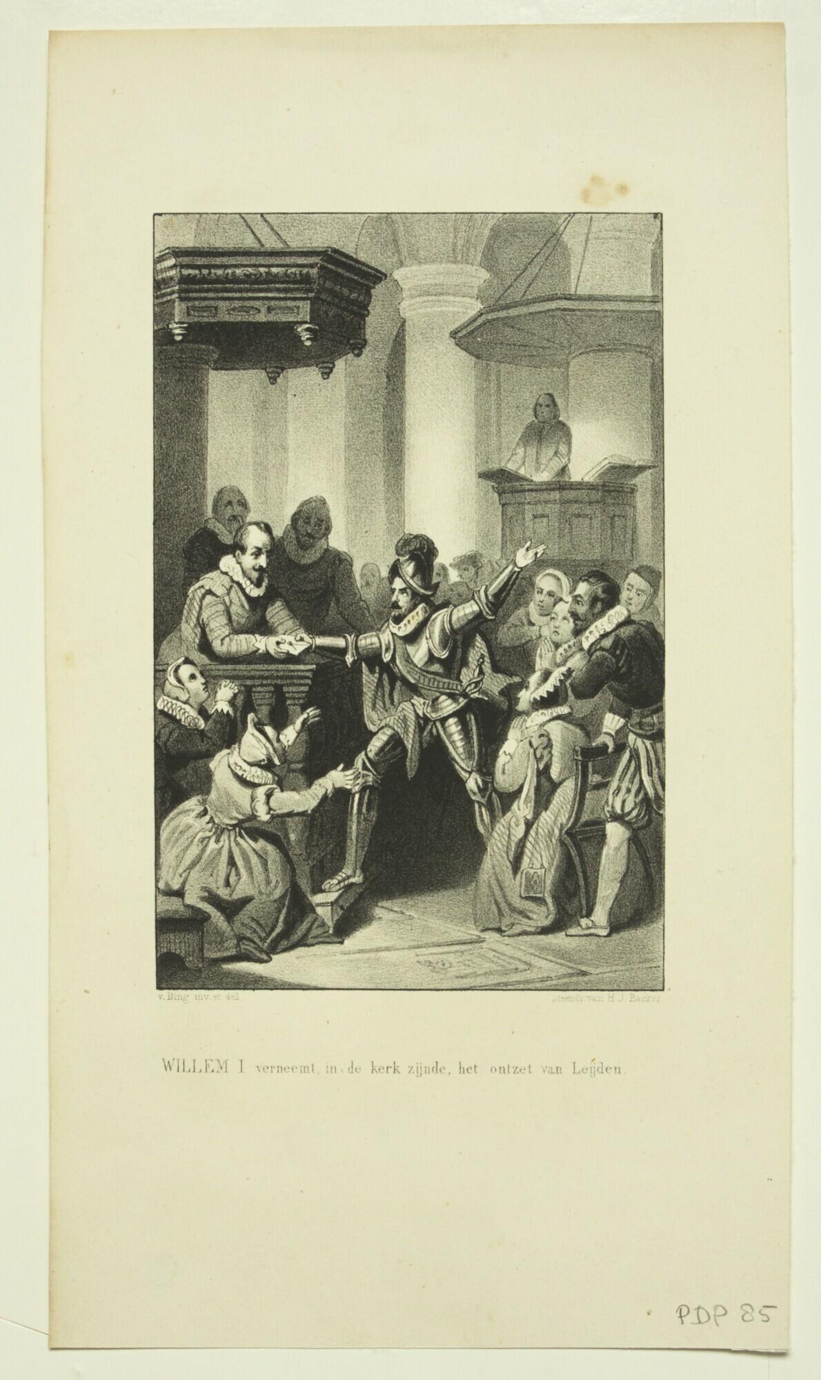Willem van Oranje verneemt tijdens een kerkdienst het nieuws van het ontzet van Leiden, 3 oktober 1574. Een soldaat in harnas overhandigt de prins een verzegelde envelop.