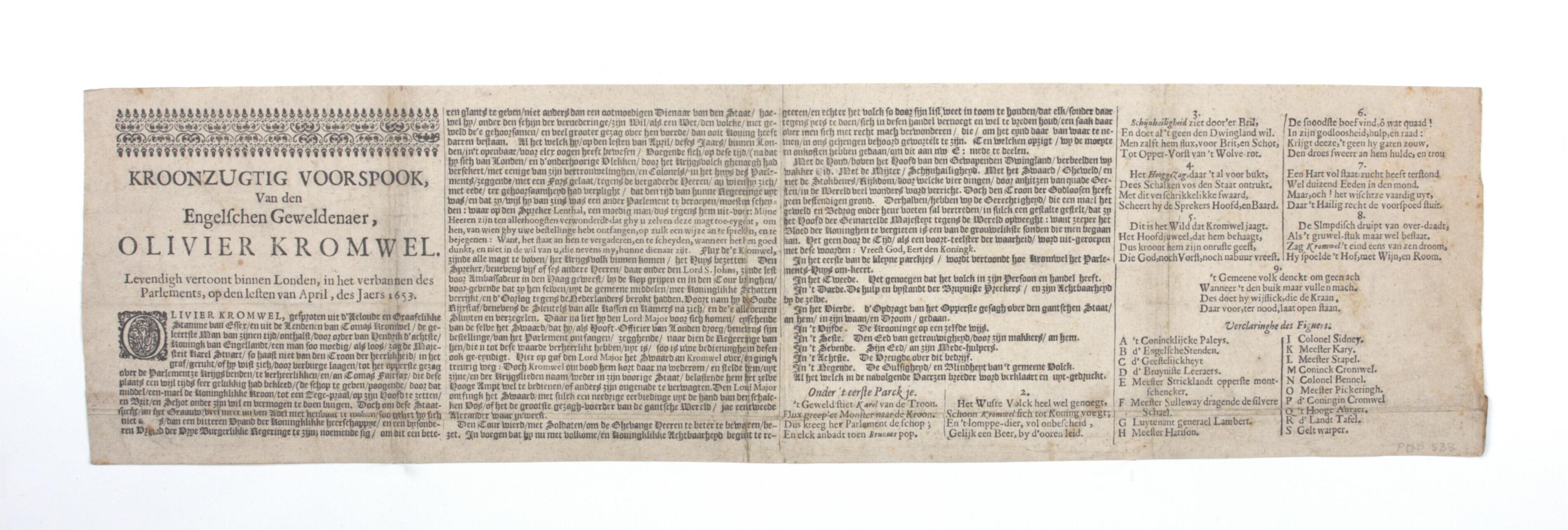 - Kroonzugtig voorspook van den Engelschen Geweldenaer, Olivier Kromwel. Levendigh vertoont binnen Londen, in het verbannen des Parlements, op den lesten van April, des Jaers 1653.