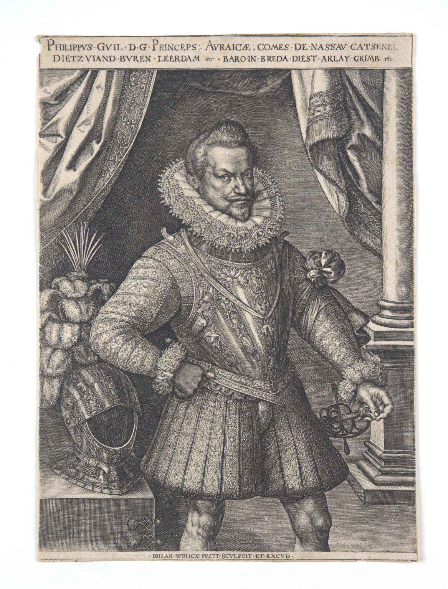 Portret van Philips Willem van Oranje Nassau (1554 - 1618), kniestuk naar rechts, rechts een kolom, links de helm op een tafel.