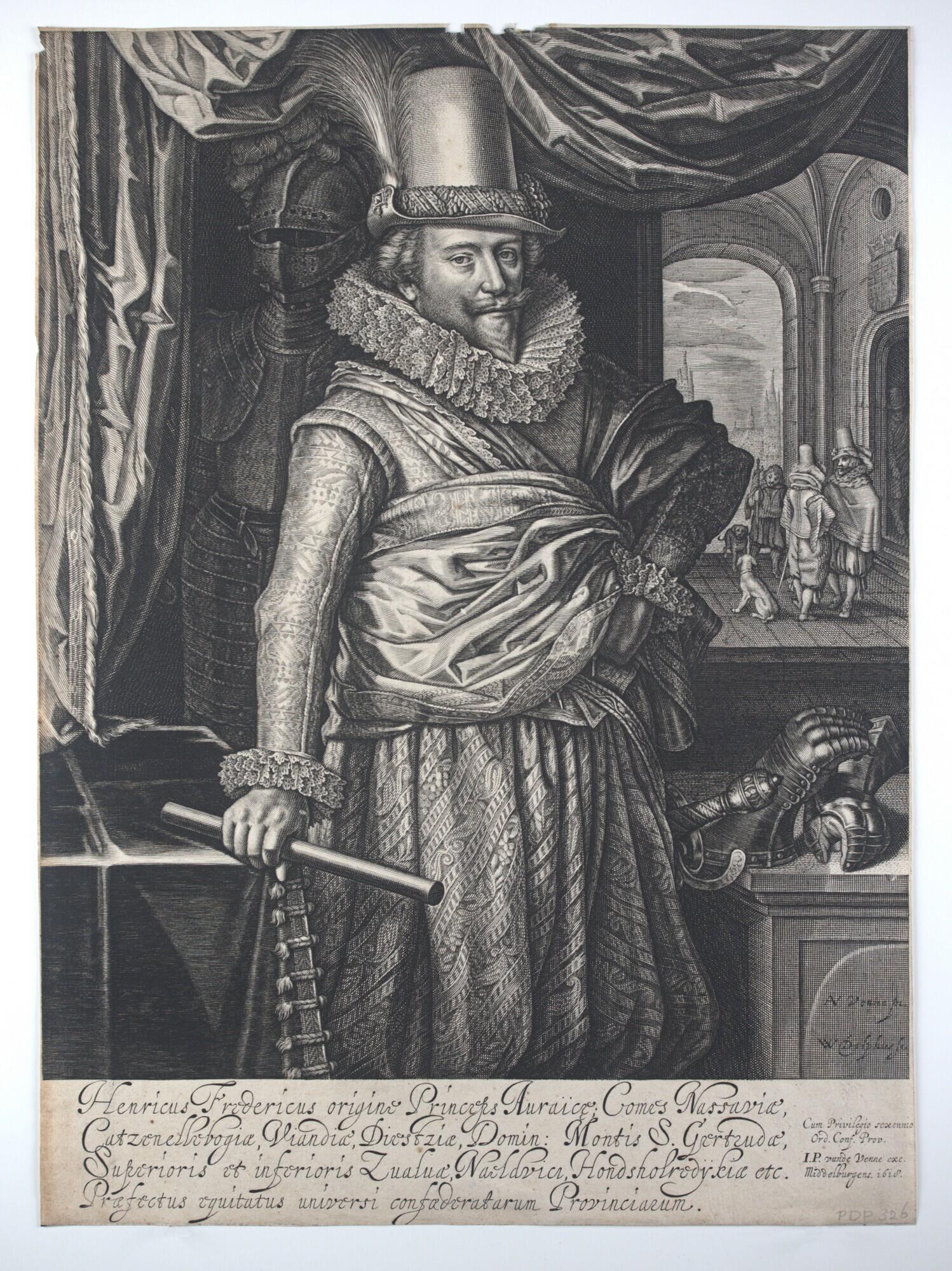 Portret van Frederik Hendrik (1584-1647), kniestuk, staand voor een harnas en draperie in kleding die met ruime plooien valt, hoge hoed op zijn hoofd. Op achtergrond doorkijk, mogelijk het Haagse Hof.