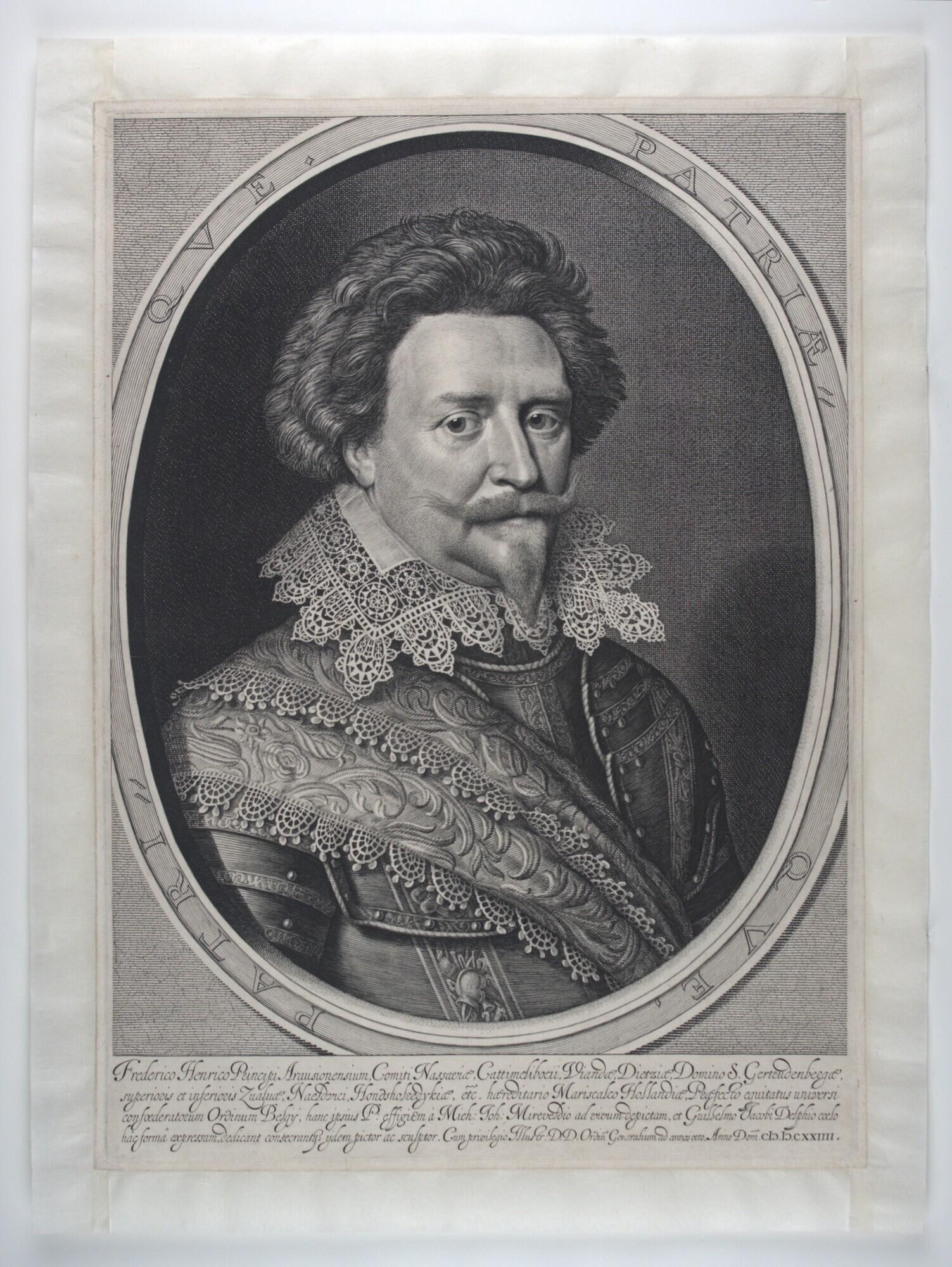 Signatureeffigiem à Mieh: Joh: Mireveldio ad vivum depictum, et Guillelmo Jacobi Delphio coelo hac forma expressam, dedicant consecrantis ijdem pictor ac sculptor. Cum privilegio Illustr D.D. Ordin Generalium ad anno octo Anno Dom CIC IC CXXIII.' (middenonder)