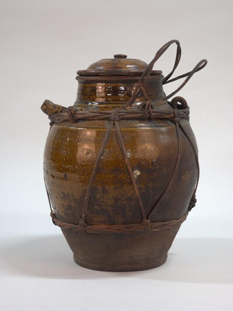 Een Chinese kruik met inheems rotan vlechtwerk om de pot aan op te hangen. Aan de voorkant een schenktuit. In dergelijke kruiken bewaarde de Dayak drank of water.