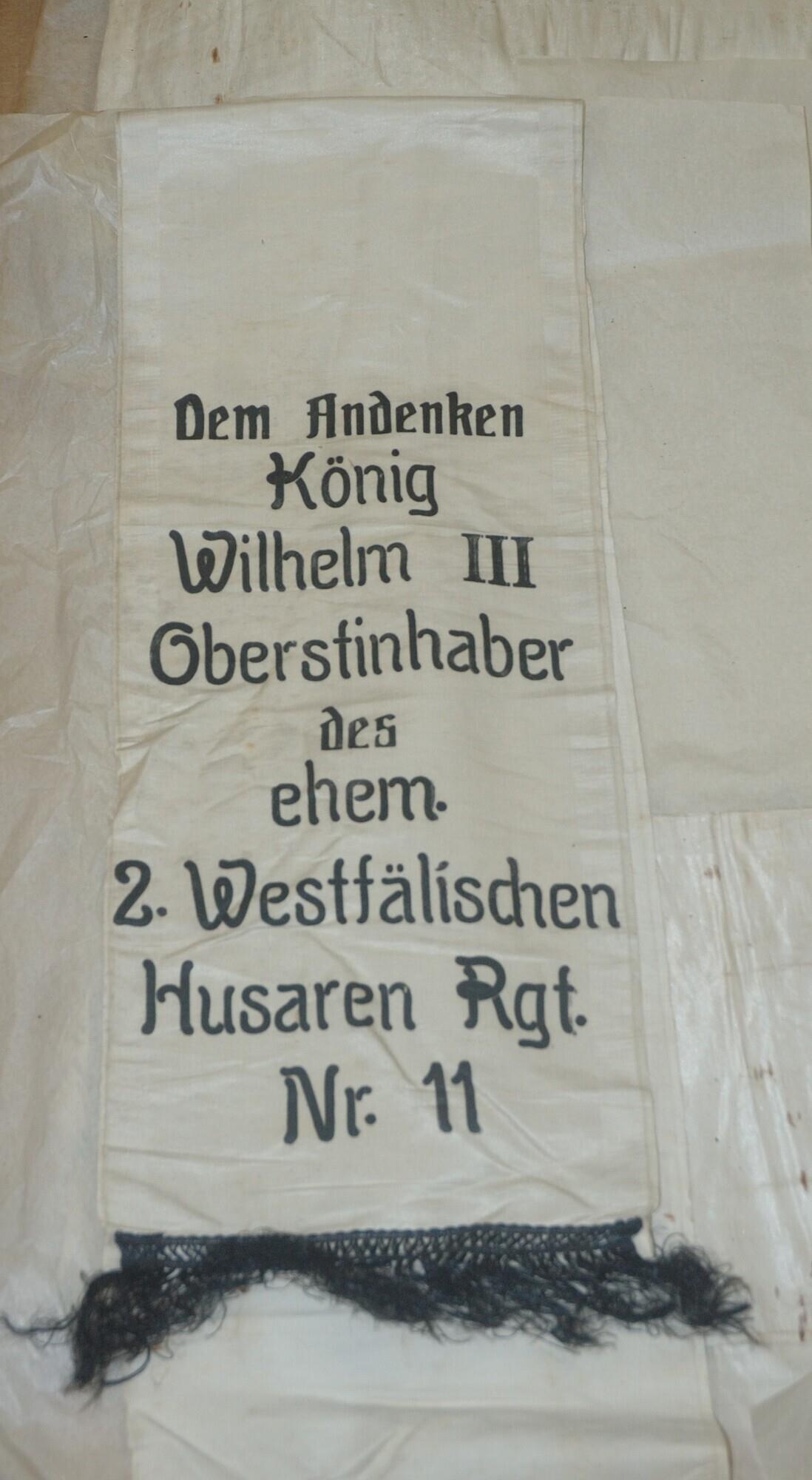 Lint met de tekst 'Dem Andenken König Wilhelm III Oberstinhaber des ehem. 2 Westfälischen Husaren. Rgt. nr. 11'