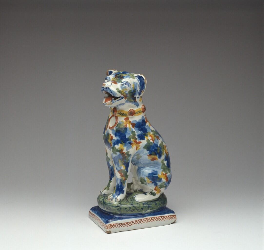 Beeldje in de vorm van een gevlekte hond met geopende bek en een gele halsband met een ring. De hond zit op de achterpoten op een ovalen grond. Het geheel is geplaatst op een rechthoekig voetstuk.