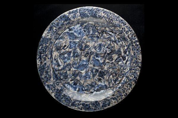 Beschrijving van het (kunst)werk: Schotel van wit porselein. Hele bord is bedekt met transfer delen en handgeschilderde motieven en tekst in blauw, mangaan en zwart.
