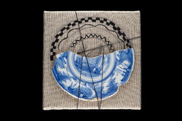 Beschrijving van het (kunst)werk: Applicatie van een porseleinen scherf op een hennep ondergrond. Hennep doek op een houten frame met een applicatie van garen, acryl verf en een half bord van aardewerk met geschilderde scheepjes op de rand en een ...