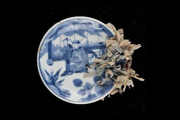 Beschrijving van het (kunst)werk: Chinees schoteltje van wit porselein met een figuratieve scène in blauw en een applicatie van strookjes papier in een bundel. Het gebroken en gelijmde Chinees porseleinen schoteltje met een figuratieve scène in bl...