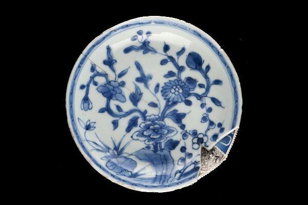 Beschrijving van het (kunst)werk: Het gebroken en gelijmde schoteltje van chinees porselein met een bloempatroon in blauw is aan de rand op de plaats van een ontbrekende scherf aangevuld door middel van postzegels.