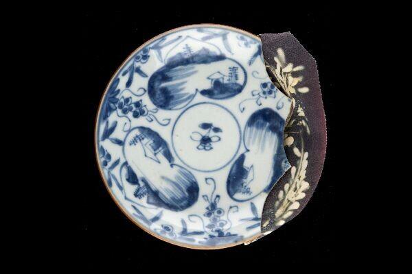 Beschrijving van het (kunst)werk: Het gebroken schoteltje van chinees porselein bord met een motief van medaillons met landschapjes en aanvullende bloemen in blauw waarbij een derde deel van de rand ontbreekt en is aangevuld met een lapje stof uit...