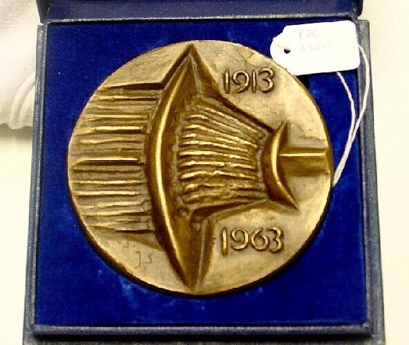 Voorzijde; Deze verbeeldt een slagmachine welke een wezenlijk element vormt in de fabricage te Delft. De beeldhouwer werd hiertoe geïnspireerd door een deel van een dergelijke machine. De jaartallen 1913-1963 geven het stichtingsjaar en het jubile...