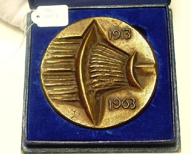 Voorzijde; Deze verbeeldt een slagmachine welke een wezenlijk element vormt in de fabricage te Delft. De beeldhouwer werd hiertoe geïnspireerd door eendeel van een dergelijke machine. De jaartallen 1913-1963 geven het stichtingsjaar en het jubileu...