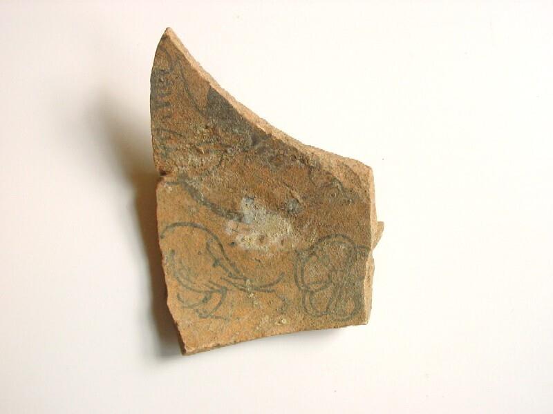 Aardewerk scherf met een decoratie oefening. Bij plateelbakkerijen zijn veel van deze 'oefenscherfjes' aangetroffen.