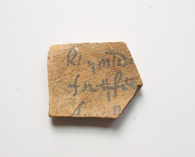 Steengoed scherf met aantekeningen. Bij plateelbakkerijen zijn veel van deze 'notitieblaadjes' aangetroffen.