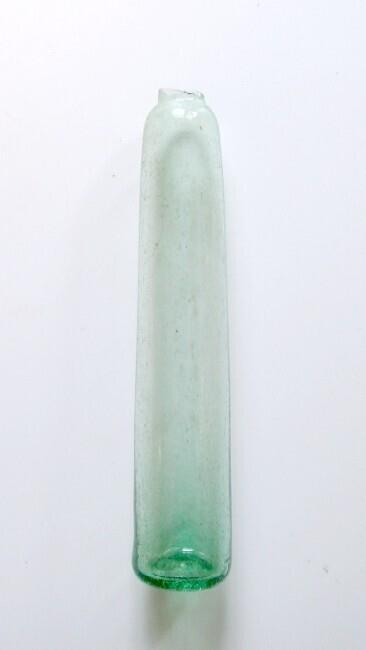 Groen getint medicijnflesje; de hals en de lip zijn afgebroken.
