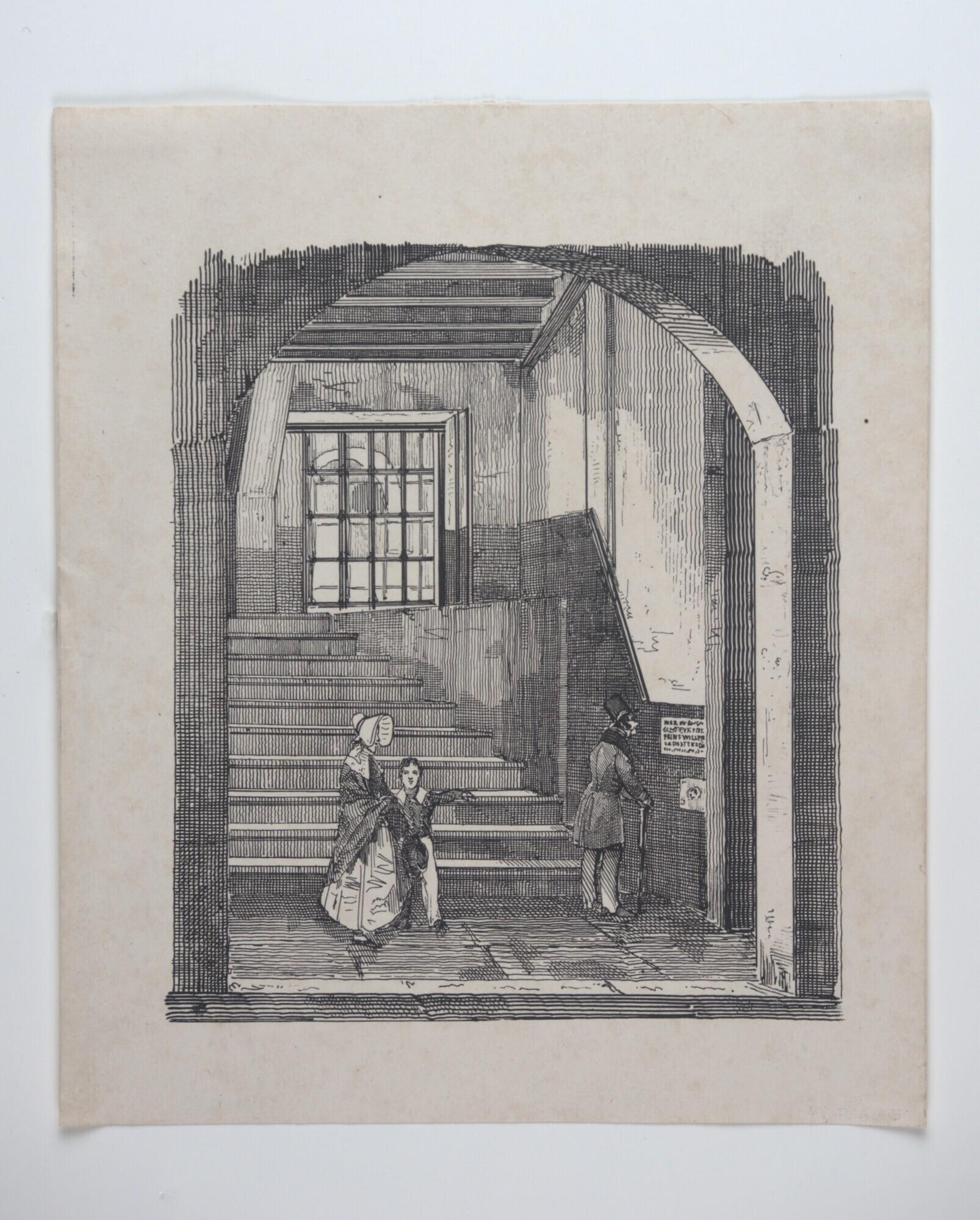 Bezoekers bij de trap in het Prinsenhof te Delft waar Willem van Oranje is vermoord door Balthasar Gerards op 10 juli 1584. Een man leest het tekstbordje, een vrouw met een jongen komen de trap af.