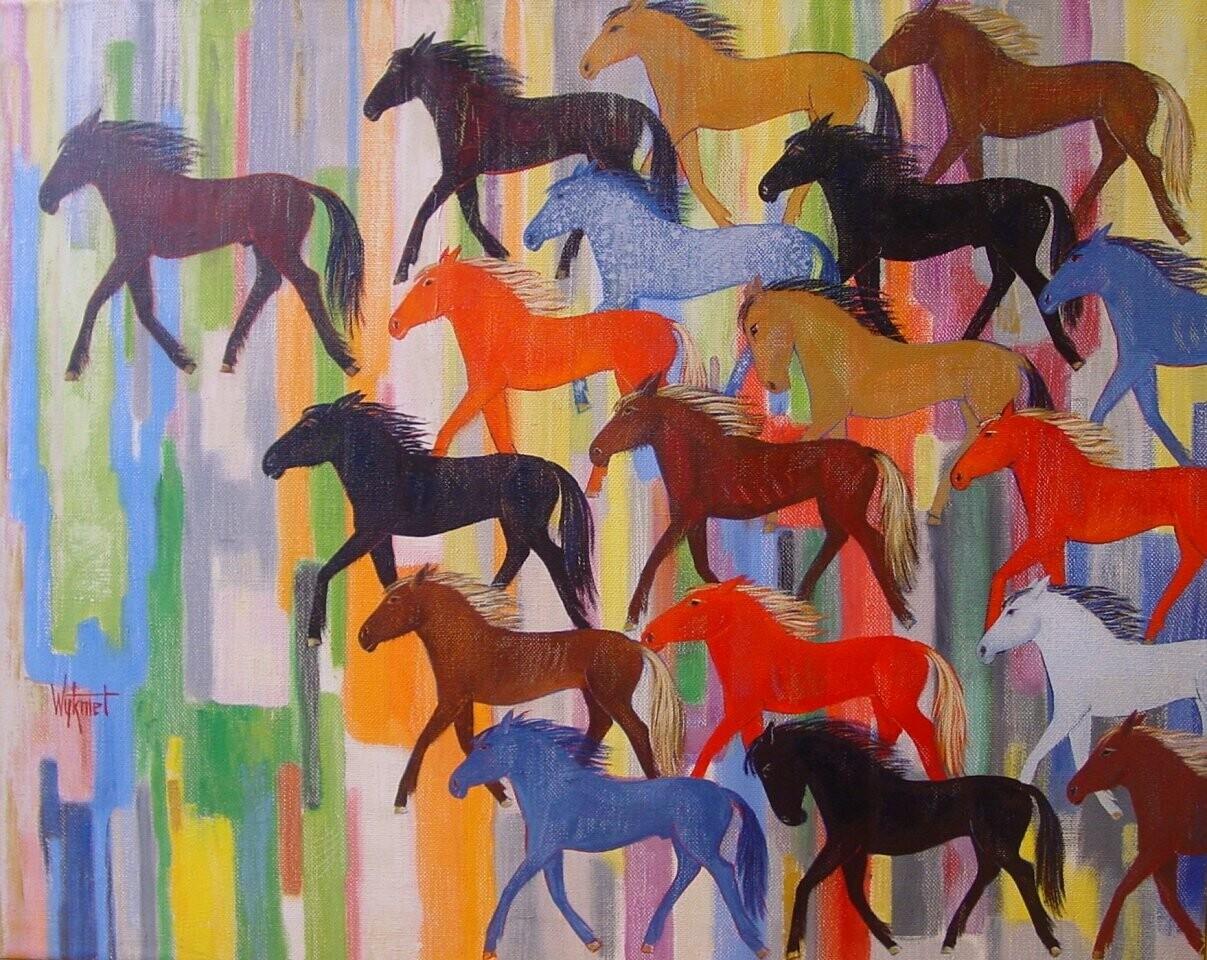 Beschrijving van het (kunst)werk: Paarden in verschillende kleuren op een ondergrond van bont gekleurde vlakken.