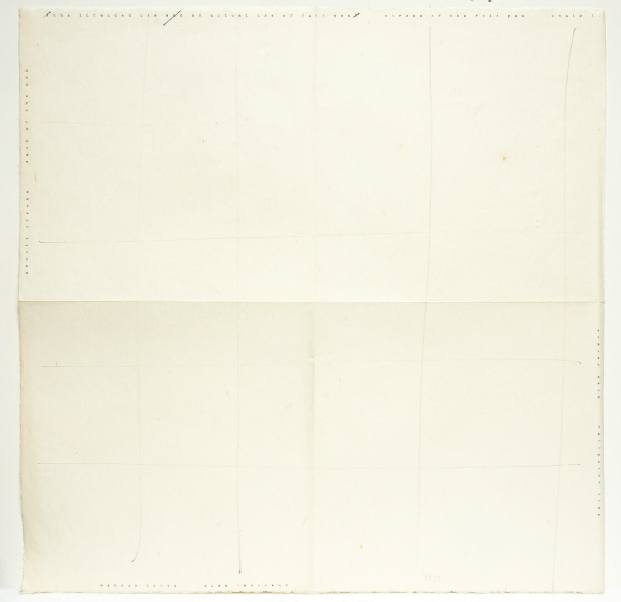 Beschrijving van het (kunst)werk: Vierkant vel wit papier met onregelmatige rand, rondom langs de rand betypt (met o.a. titel van het werk). Over het blad lopen horizontale en verticale lijnen.