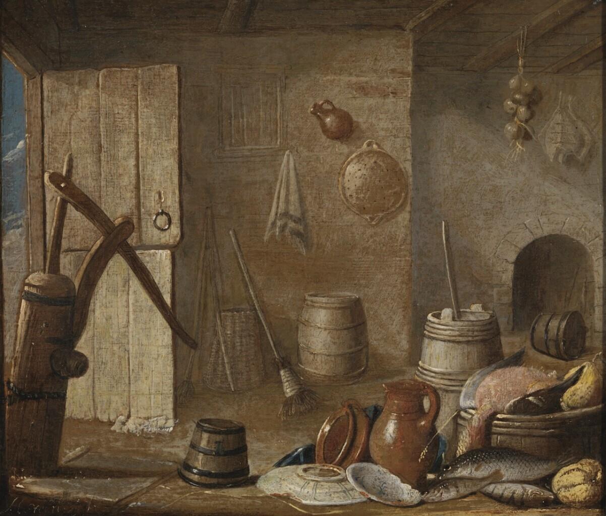 Boerderijstilleven met links een geopende deur, verschillende voorwerpen waaronder een pomp, omgekeerde emmer, aardewerk schotels, bruine kan, omgekeerde tobbe waarop een dode vogel en karn. Tegen de muur verschillende voorwerpen.