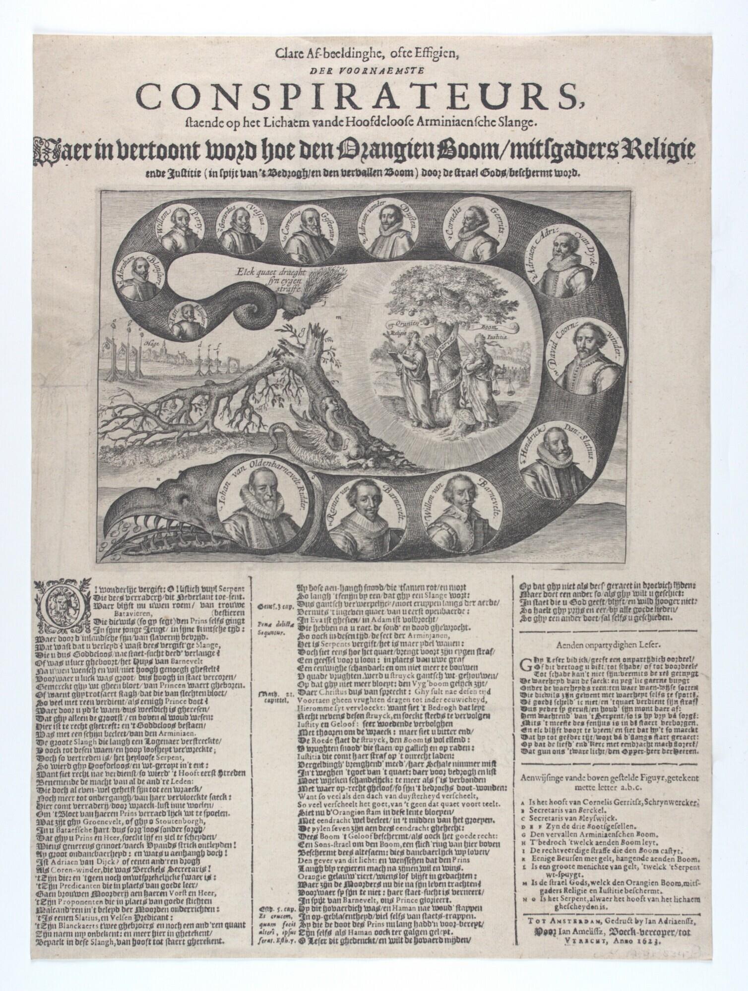 Clare Af-beeldinghe, ofte Effigien, der voornaemste Conspirateurs, staende op het Lichaem vande Hoofdeloose Arminiaensche Slange.