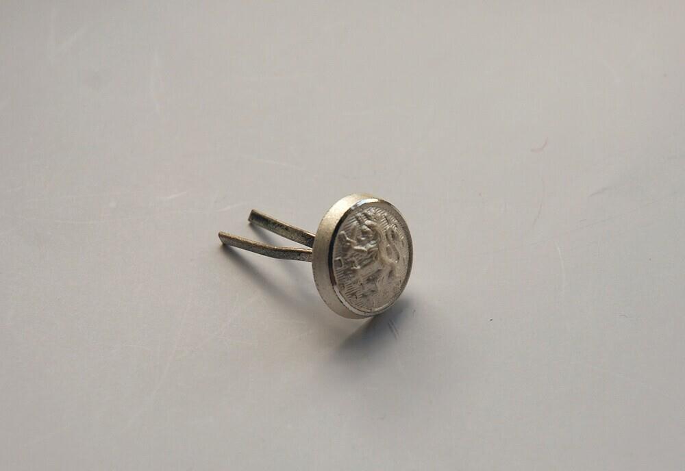 Knoop/pin, zilverkleurig. Aan achterkant steken 2 metalen pinnen uit, die gebruikt kunnen worden om het object op kleding te bevestigen.