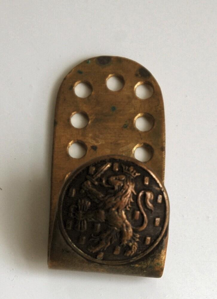 Haak, koperkleurig, waarvan een derde deel (het voorste deel) omgebogen is en waar een wapen in is geponst. Dit wapen draagt een staande leeuw met zwaard en kroon. De achterkant, twee derde deel is aan de bovenkant afgerond en heeft 9 kleine geboo...