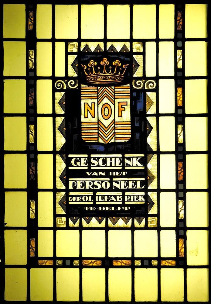 - Glas-in-loodraam 'Geschenk van het personeel der Oliefabriek te Delft'