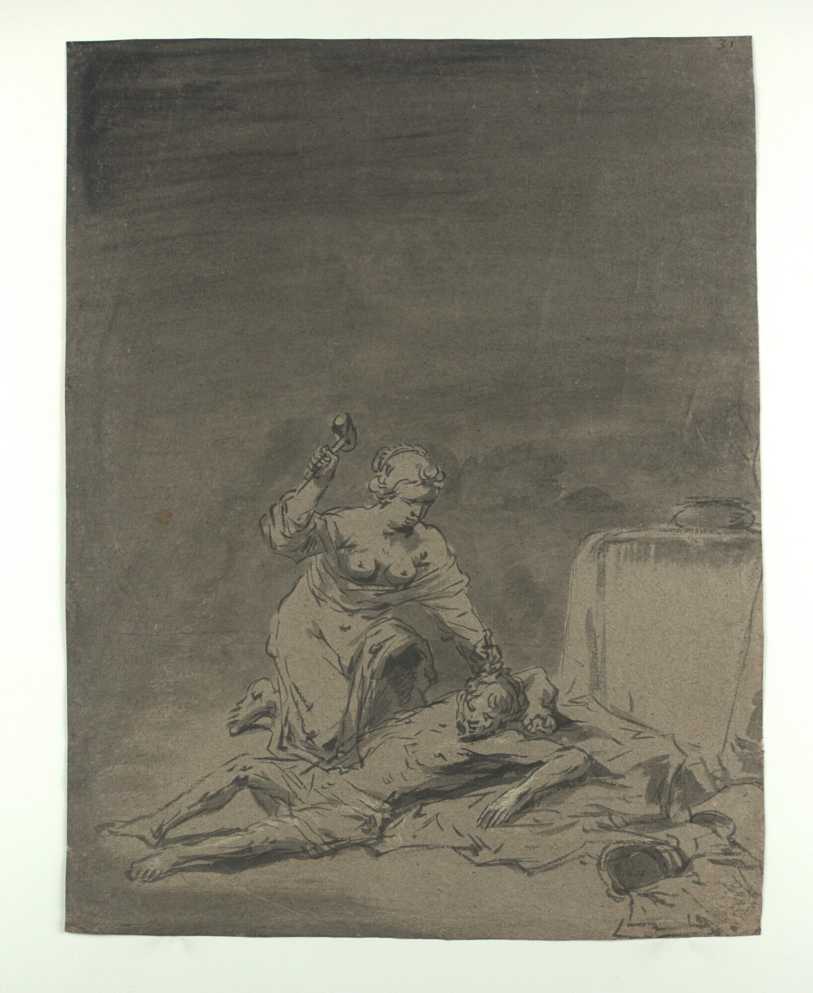 - donkergrijs lompenpapier, zonder watermerk met vergé, penseel in zwart en grijs in combinatie met grijze wassingen en bruine dekverf