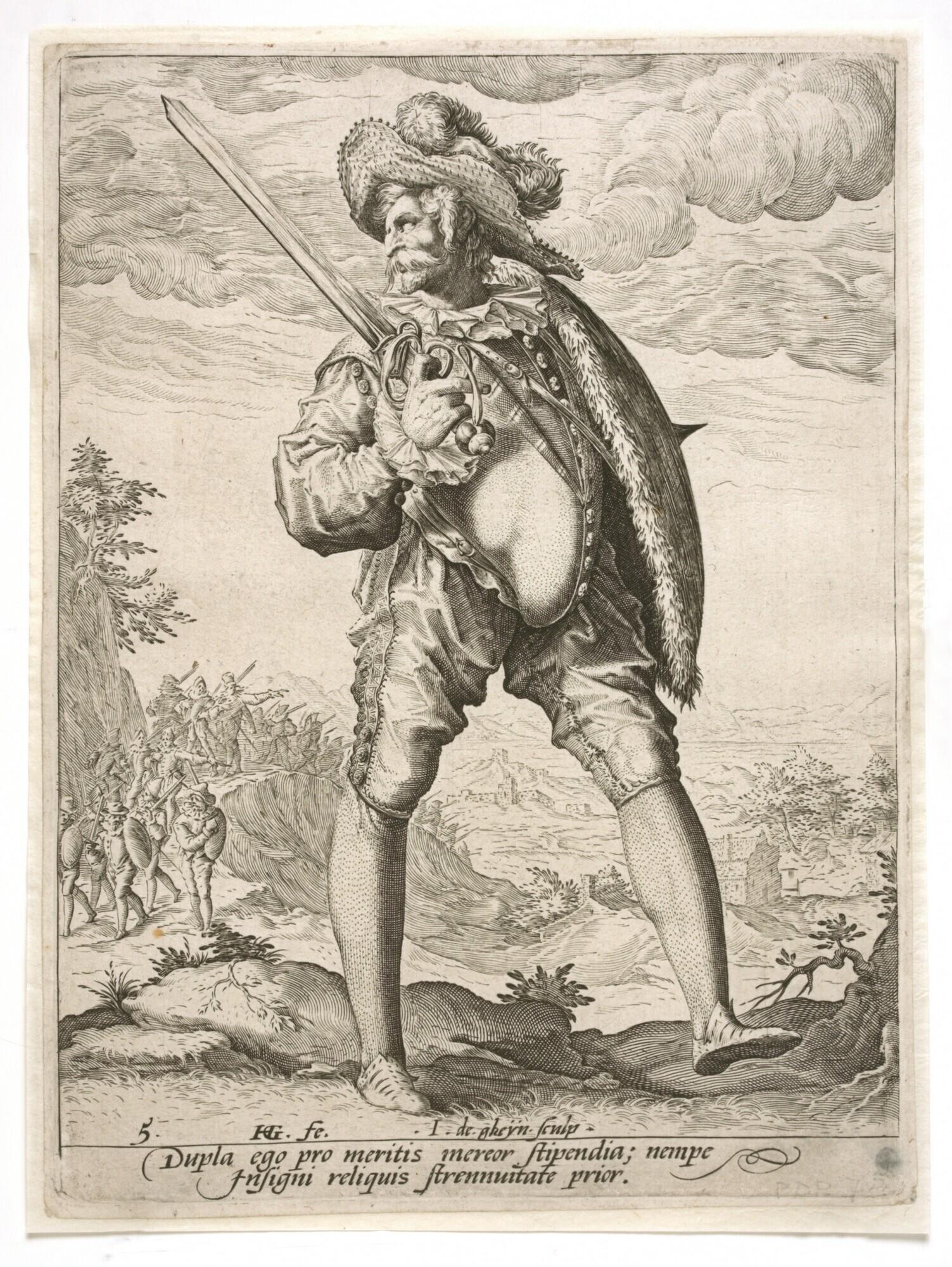 Een soldaat met een zwaard in de rechterhand en een schild in de linkerhand, ten voeten uit. Op de achtergrond een heuvelachtig landschap waarin een troep soldaten marcheert. Onder de voorstelling twee regels tekst in Latijn 'Dupla ego pro meritis...