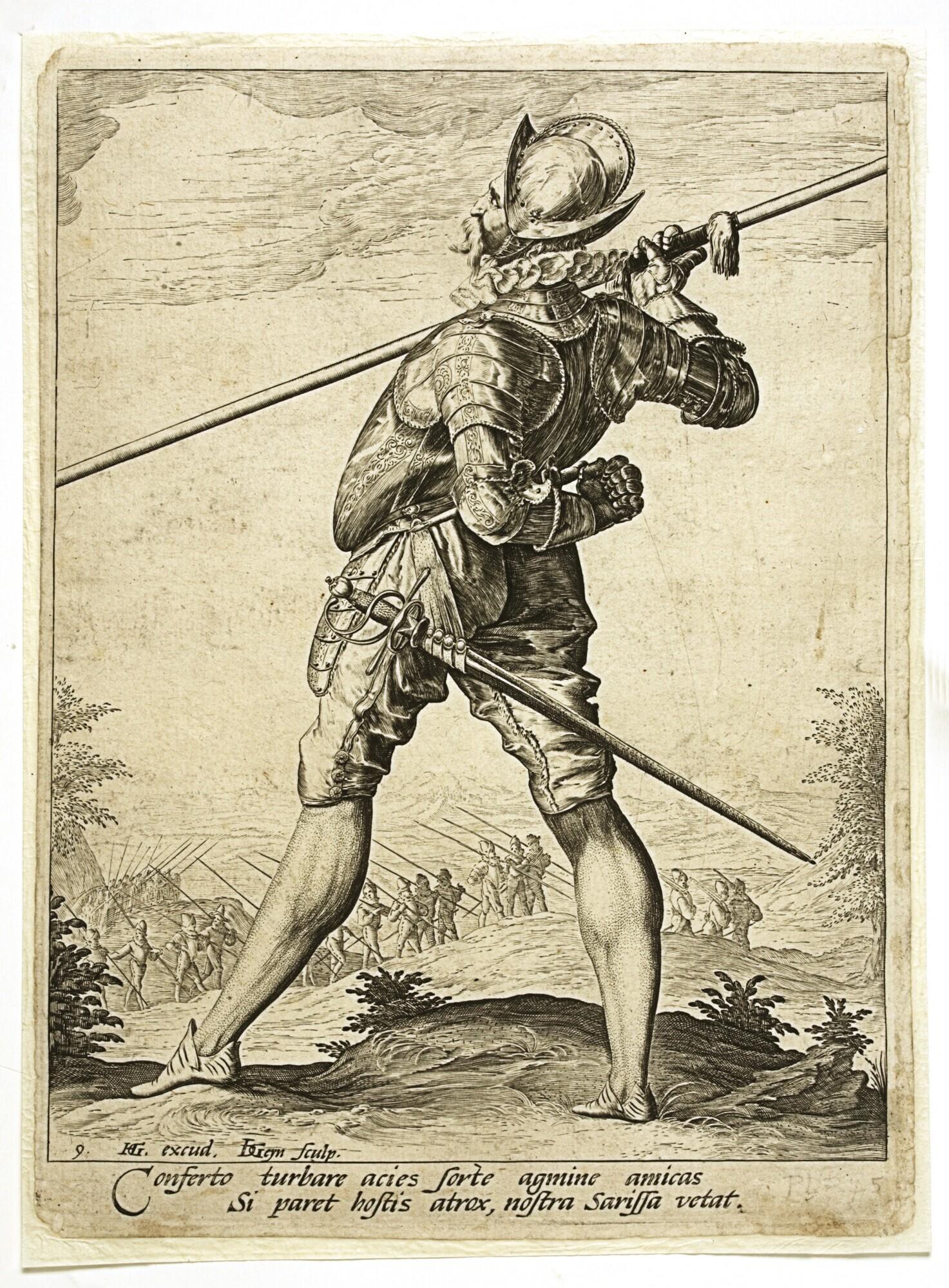 Een man in militaire uitdossing (een piekenier), ten voeten uit, op de linkerzijde gezien, een zwaard aan zijn gordel, een stokwapen (piek of lans) in zijn rechterhand. Op de achtergrond een heuvelachtig landschap waarin een troep soldaten marchee...