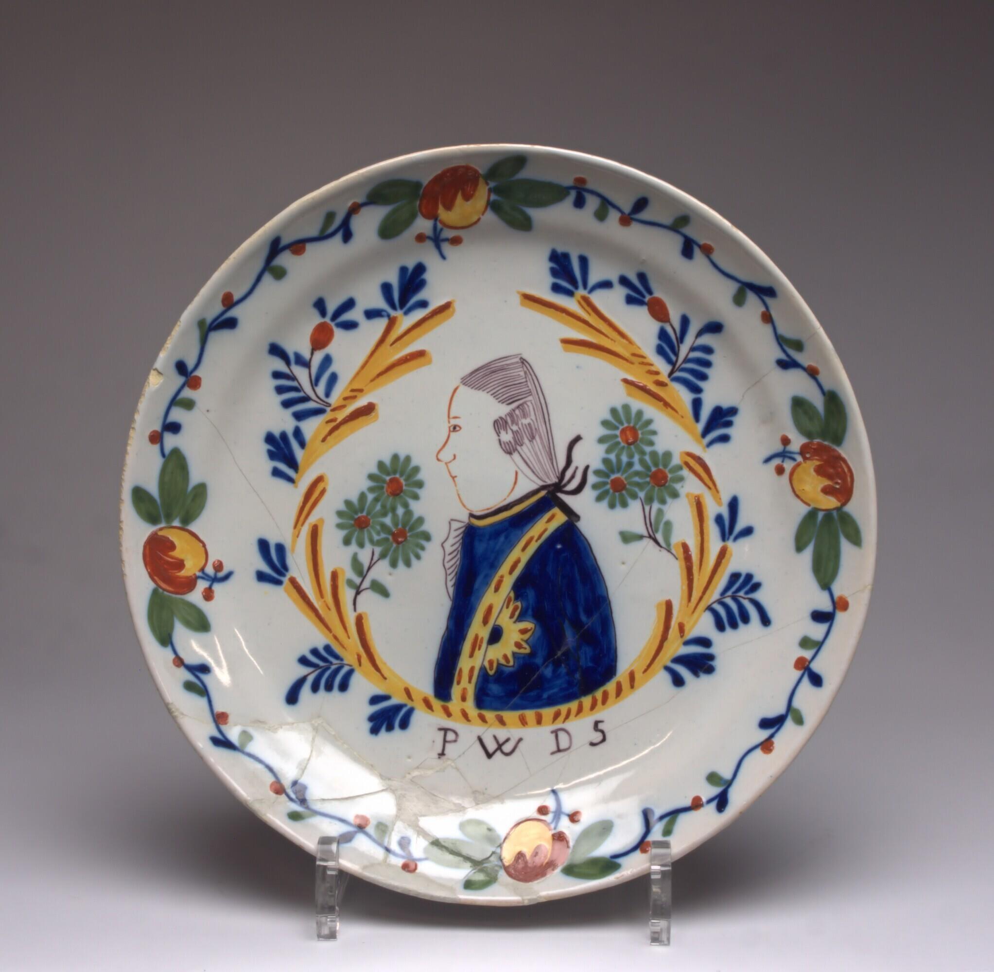 Bord zonder standring met op het plat een halfportret, en profil naar links, van Willem V met pruik en gehuld in blauw uniform met oranje sjerp, rozet en witte bef. Het portret is omlijst met een oranje krans met bloemranken. Op de rand een zoom v...