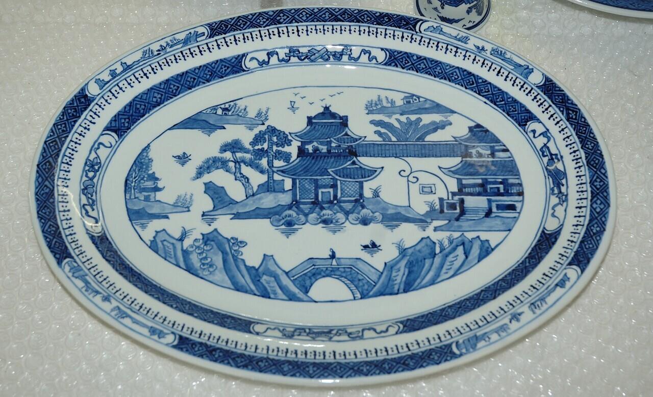 Ovale schaal met een decoratie van een Chinees landschap met brug en paviljoens, randen met servetwerk en cartouches met landschapjes en geluksemblemen.