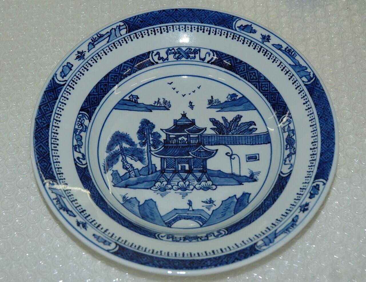 Rond diep bord met een decoratie van een Chinees landschap met brug en paviljoen, randen met servetwerk en cartouches met landschapjes en geluksemblemen.