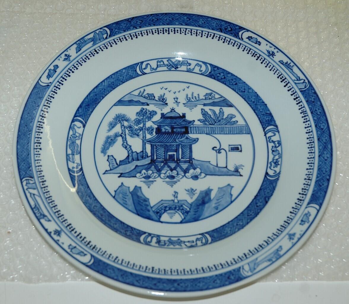 Rond (diner)bord met een decoratie van een Chinees landschap met brug en paviljoen, randen met servetwerk en cartouches met landschapjes en geluksemblemen.
