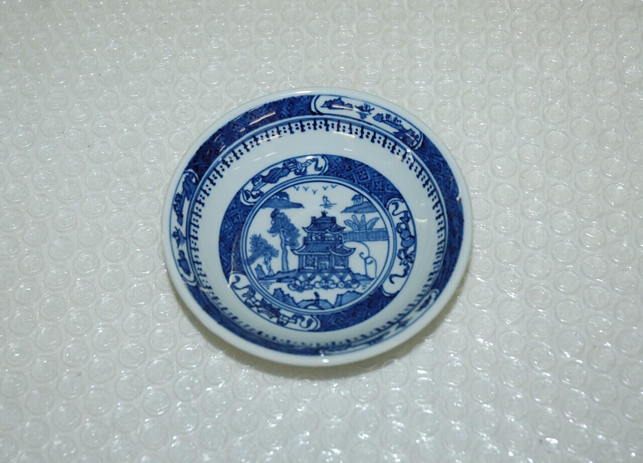 Rond schaaltje met een decoratie van een Chinees landschap met brug en paviljoen, randen met servetwerk en cartouches met landschapjes en geluksemblemen.