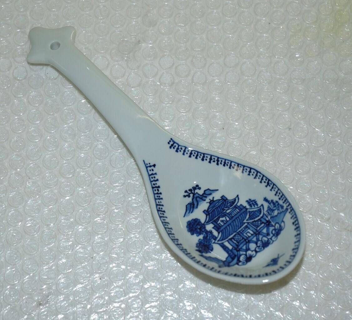 (Opschep)lepel, rijstlepel, met een decoratie van een Chinees landschap met paviljoen.