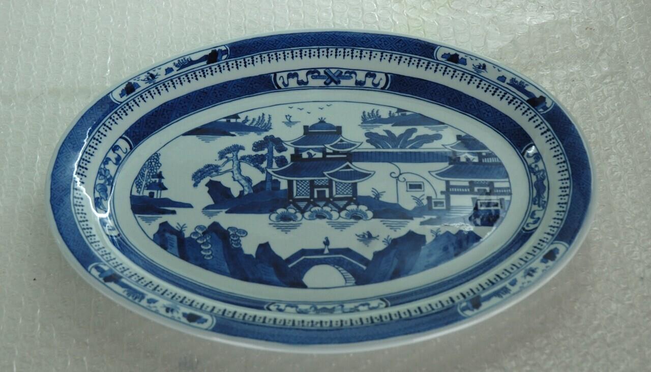 Ovale schaal met een decoratie van een Chinees landschap met brug en paviljoens, randen met servetwerk en cartouches met landschapjes en geluksemblemen.