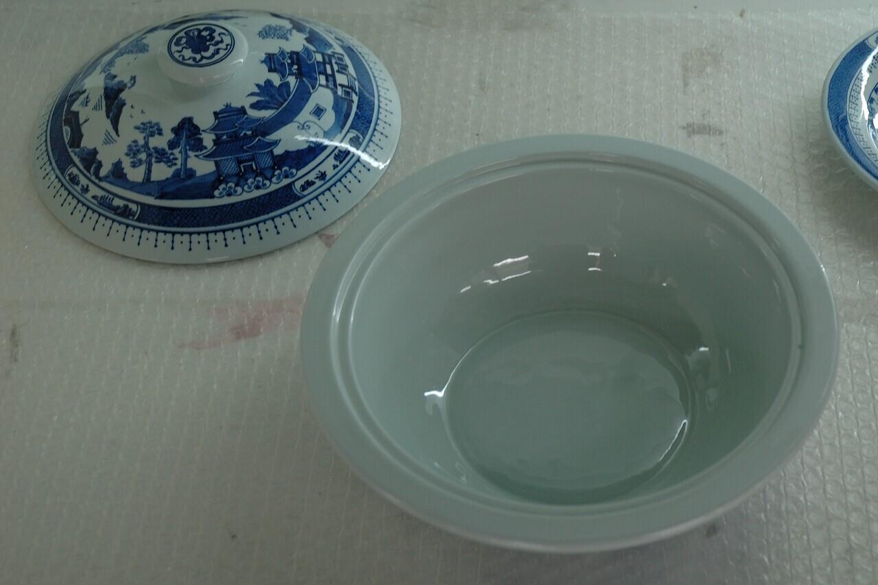 Ronde (dek)schaal met deksel met een decoratie van een Chinees landschap met brug en paviljoens, randen met servetwerk en cartouches met landschapjes. Op de knop een artemisia blad en geluksstrikken.