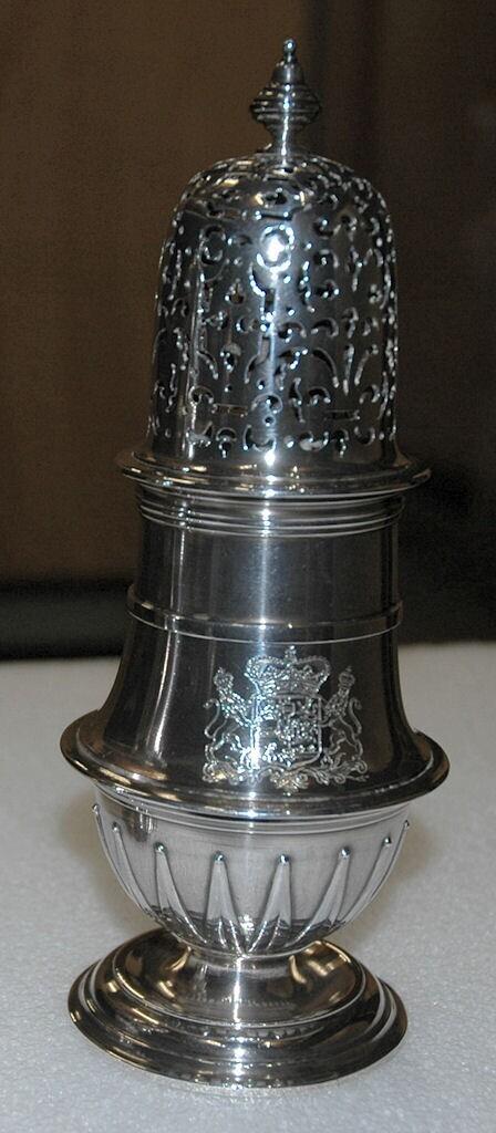 Suikerstrooier, stel, met geprofileerde voet en geprofileerd rond lijf waarop het wapen van Willem IV is gegraveerd. De doppen zijn in ajourwerk.