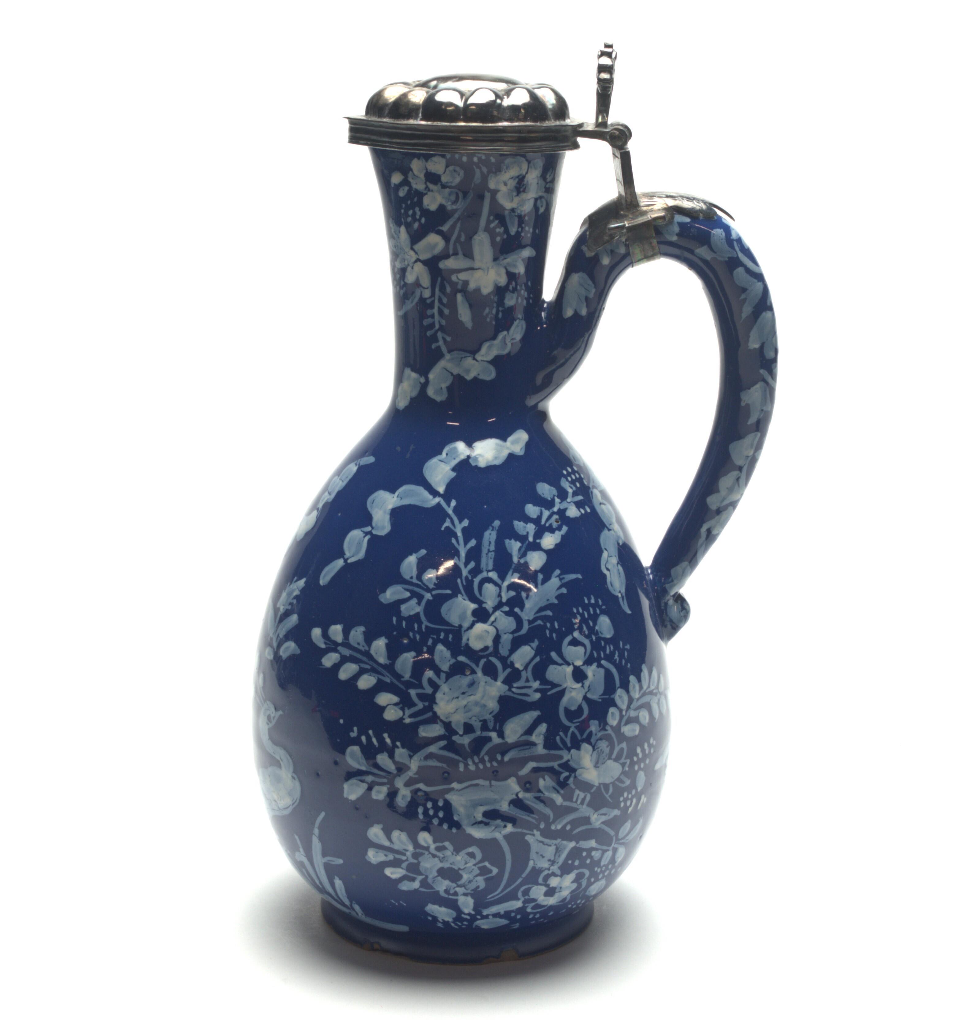 Kan voorzien van een zilveren montuur bestaande uit een gelobd deksel, een verbinding met het voluutvormige oor en een duimstuk dat is gevormd uit twee gekruiste drakenkoppen. De witte decoratie op de Nevers-blauwe ondergrond bestaat uit vogels en...