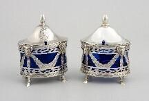 De spits ovalen zilveren mosterdpot heeft een opengewerkte wand met blauw glazen binnenbakje en scharnierende deksel; zij rust op vier bokkenpootjes. De wanden zijn versierd met twee banden met bladranken, waartussen golvende guirlandes en draperi...