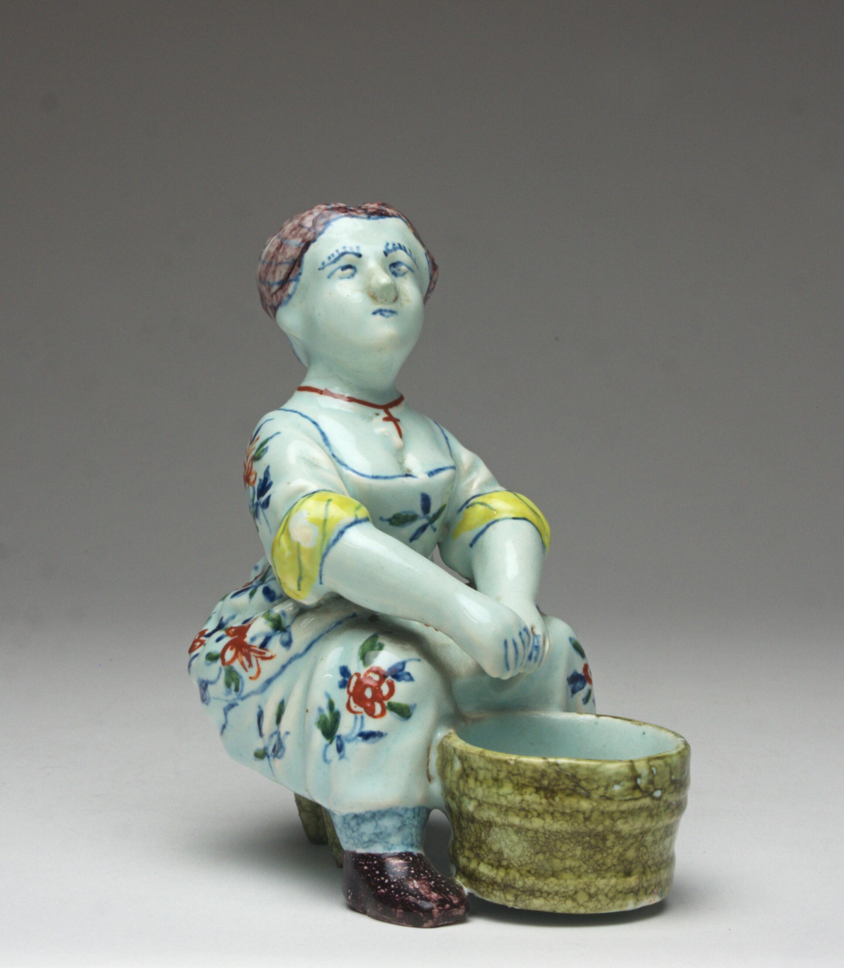 Het zoutvaatje is gemodelleerd als een melkster, zittend op een kruk met drie poten en houdt een emmer tussen de benen geklemd. Het vrouwelijke figuur heeft een gebloemde jurk aan waarvan de mouwen zijn opgestroopt.