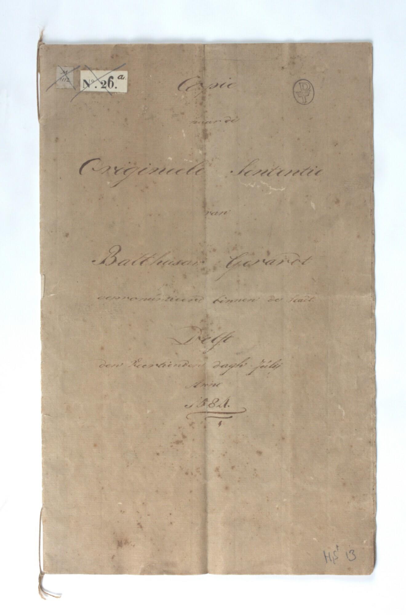 - 'Copie naar de Origineele Sententie van Balthasar Gerards Gepronuntieerd binnen de Stad Delft den Veertienden dag July Anno 1584'