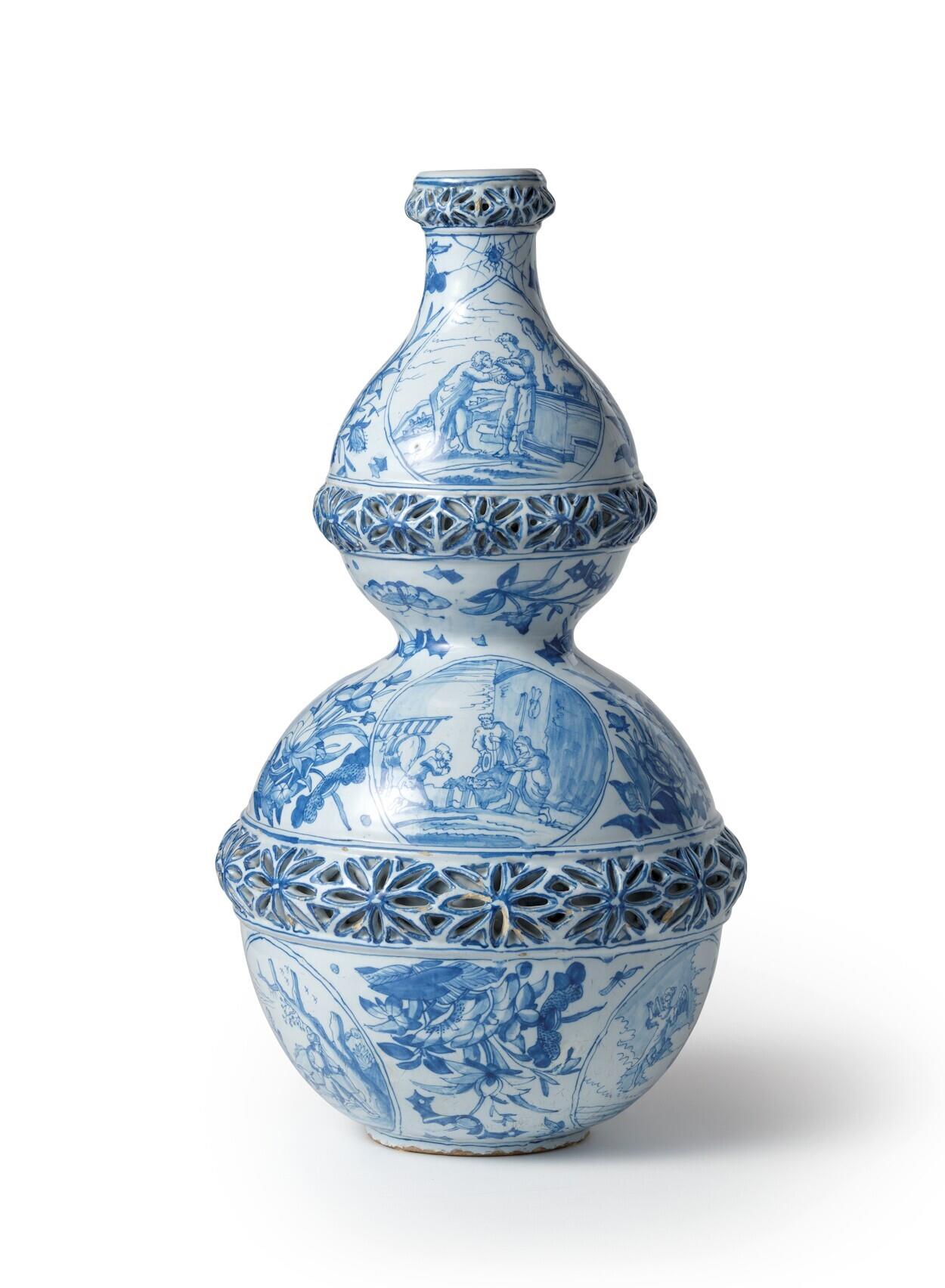 Kalebasvormige vaas met opgelegde, opengewerkte sierbanden en medaillons met Bijbelse voorstellingen: Lot en zijn dochters; Tobias en de Engel; Rebecca bij de bron; de Annunciatie; de Visitatie; de Aanbidding van de herders; de Vlucht naar Egypte;...