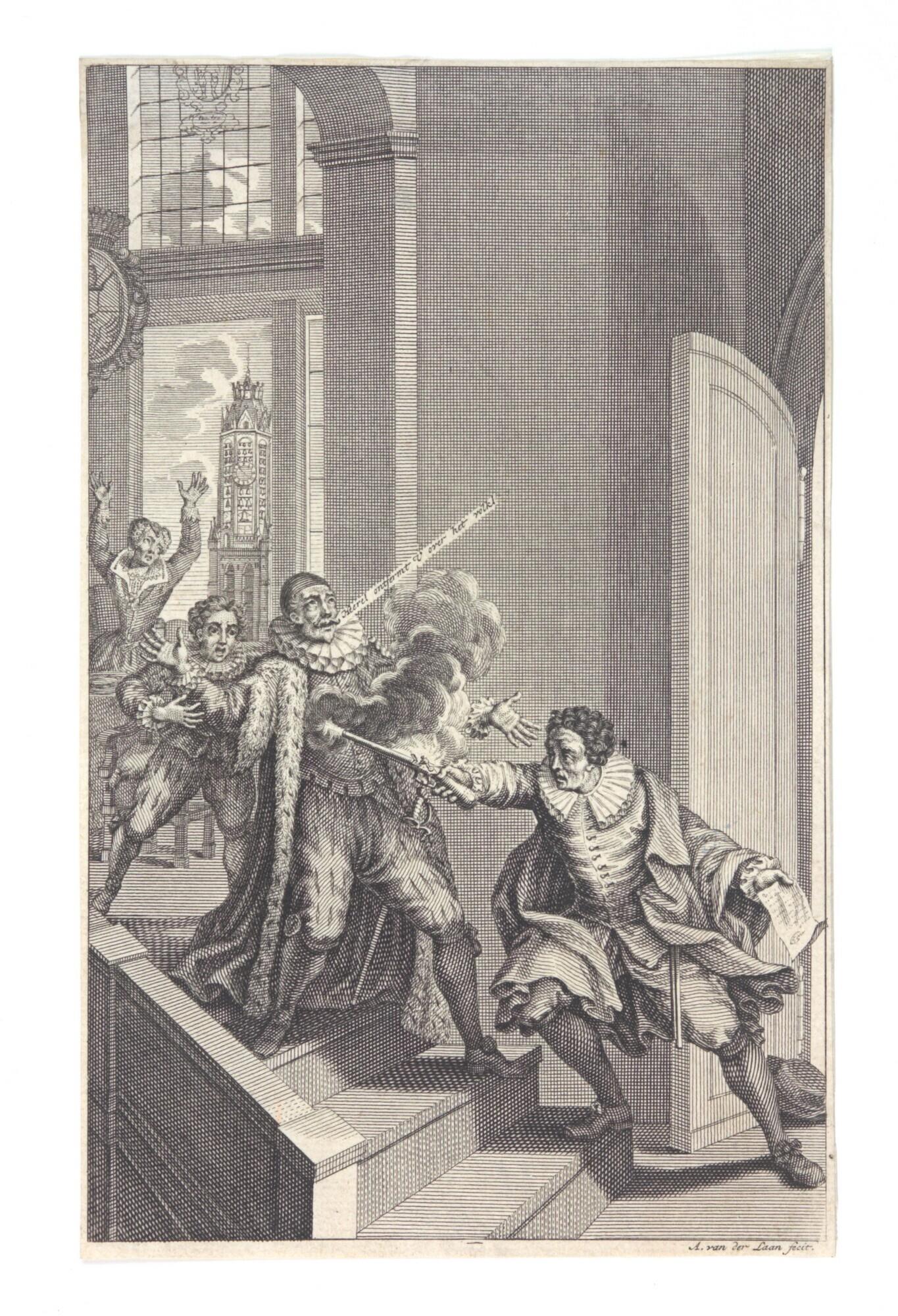 De prins van Oranje te Delft vermoord door Balthasar Gerards, 10 juli 1584. Willem van Oranje wordt op een trap bij de openstaande deur neergeschoten door Balthasar Gerards. Uit de mond van de prins komen de woorden: Heere! ontfermt U over het vol...