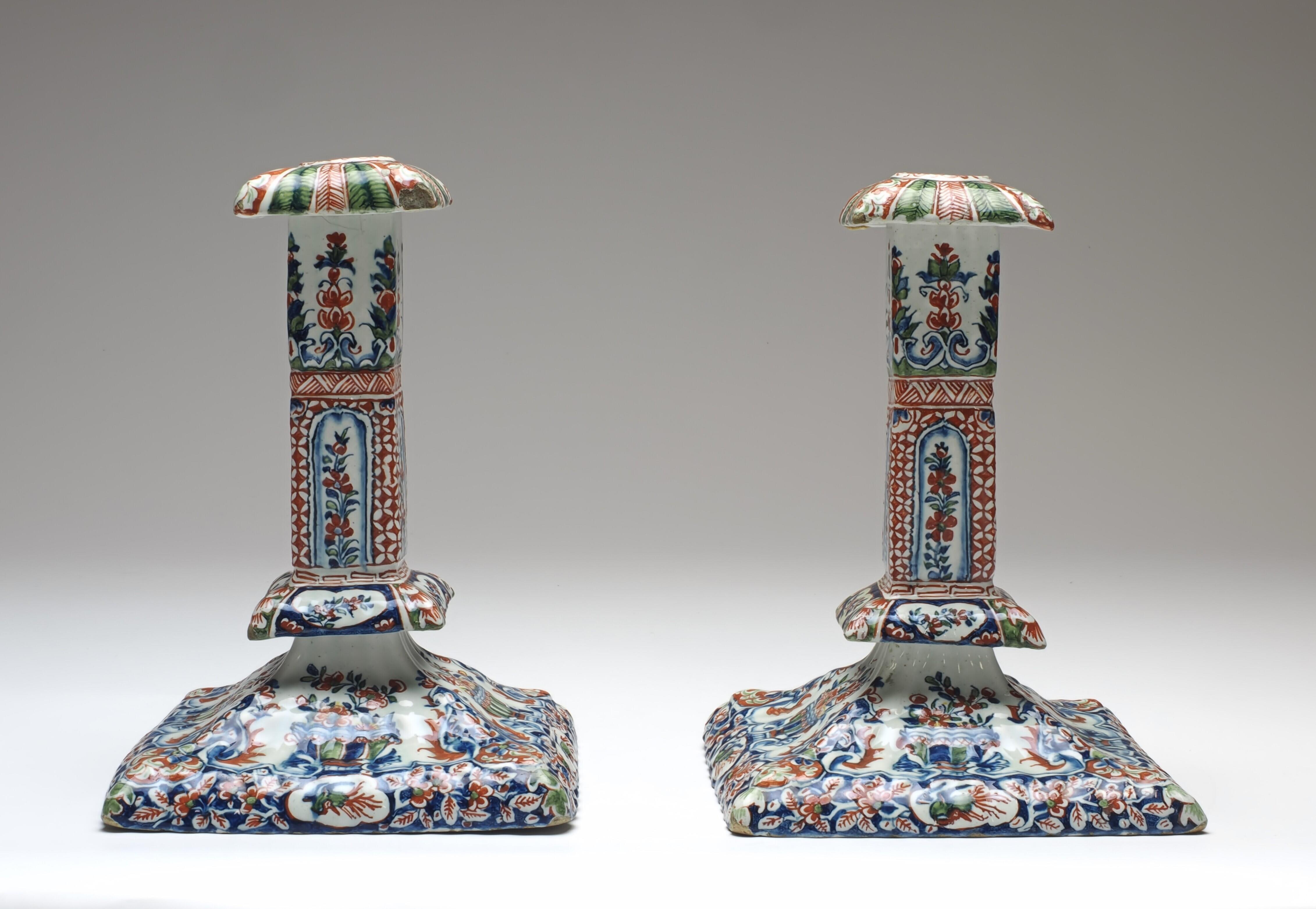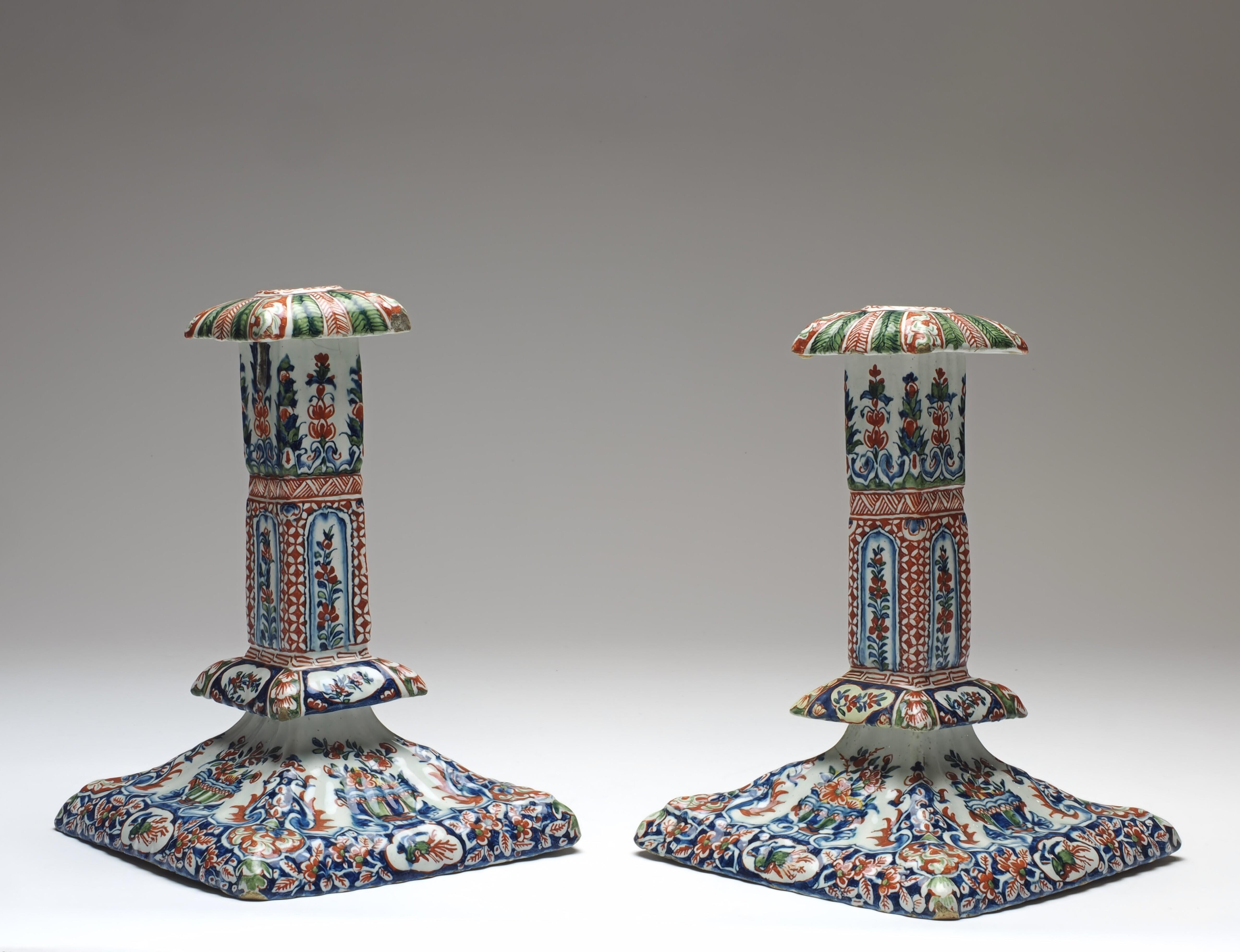Rechthoekige, met een licht geribde voet en reliëf-schacht uitgevoerde, kandelaar op de voet gedecoreerd met gevulde bloemenhouders gescheiden door lambrequinmotieven. Langs de rand is een band met bloemtakken en vogels. De schacht en de kraag zij...