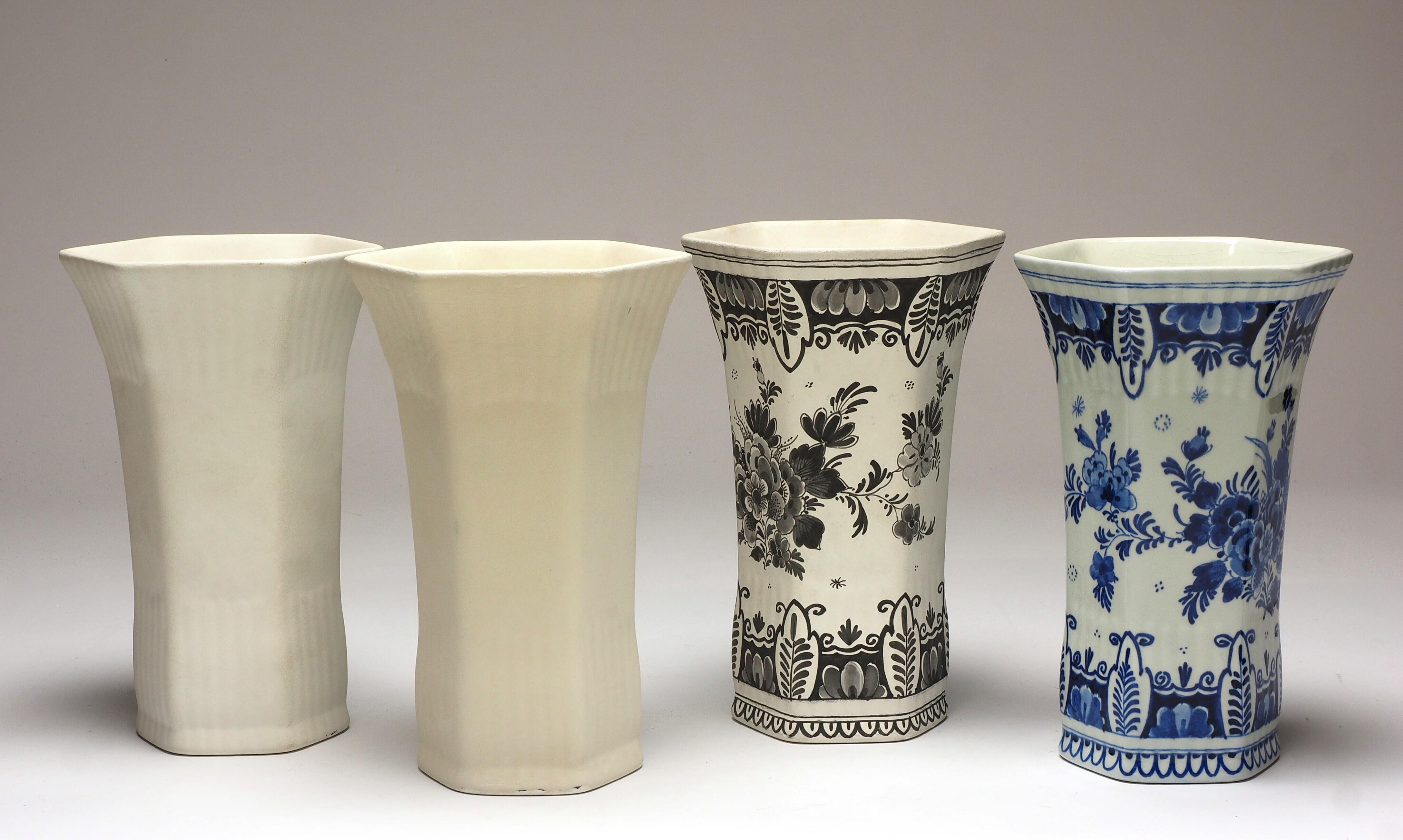 De set, waar deze vaas deel van uitmaakt, bestaat uit vier zeshoekige vazen die de diverse stadia van decoreren tonen. Een van de vazen is een onbeschilderde biscuit gebakken vaas. De hieropvolgende vaas is eveneens van onbeschilderd biscuit en v...